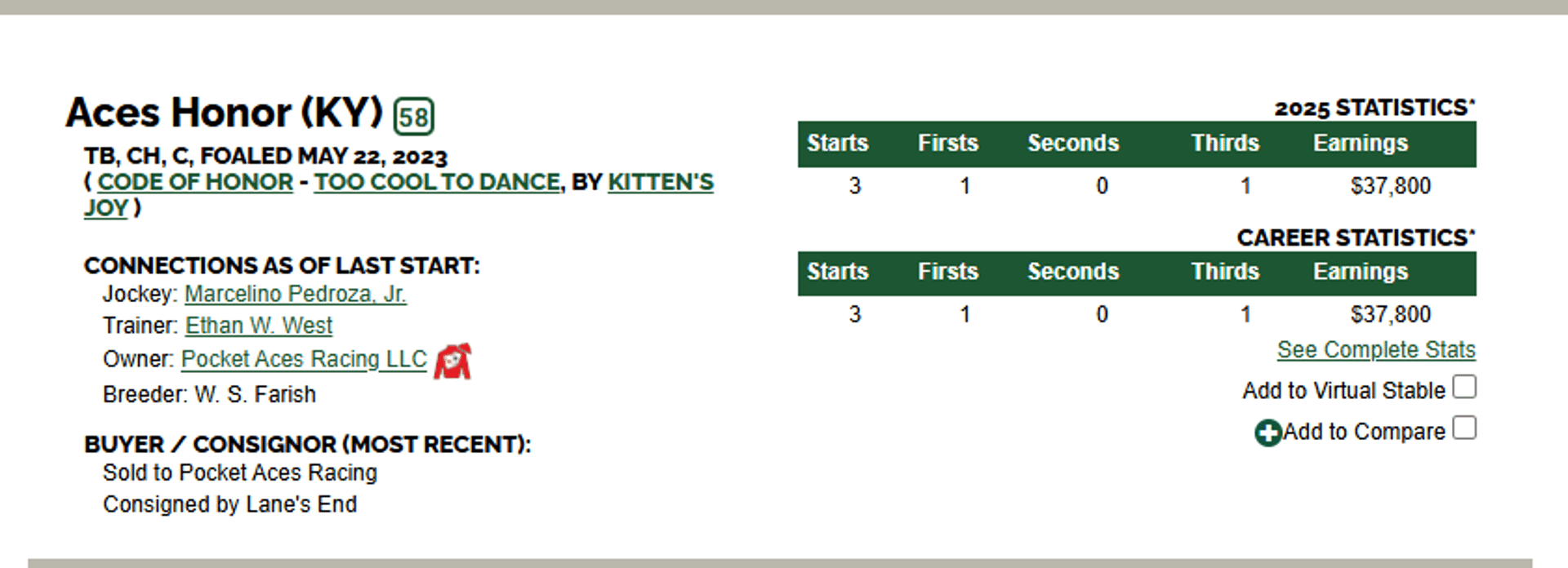 Aces Honor, (2023) Code of Honor Thoroughbred Colt out of Too Cool to Dance owned by Pocket Aces Racing LLC.